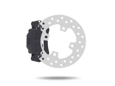 AT5L koma með diskabremsum allan hringinn. Þannig notar þú aðeins eitt bremsuhandfang eða fótbremsuna til að taka jafnt á öllum hjólum í einu. Hitt bremsuhandfangið er svo hefðbundin handbremsa með vír aftur, sem virkar þá sem neyðarbremsa.