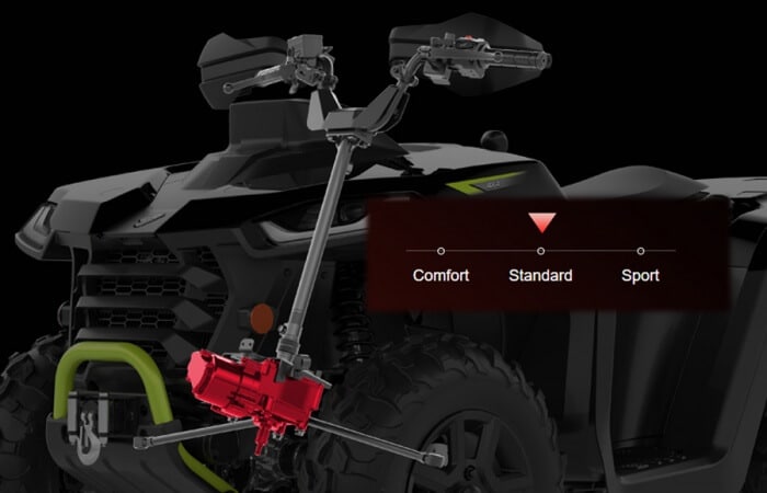 Í hjólunum er rafmagnsstýri sem aðlagar sig sjálft miðað við aksturshraða og aðstæður, til dæmis hvort hjólið sé í fjórhjóladrifi og læsingum. Þú getur svo valið í appinu á milli þriggja stillinga um það hversu þungt eða létt þú vilt hafa stýrið.